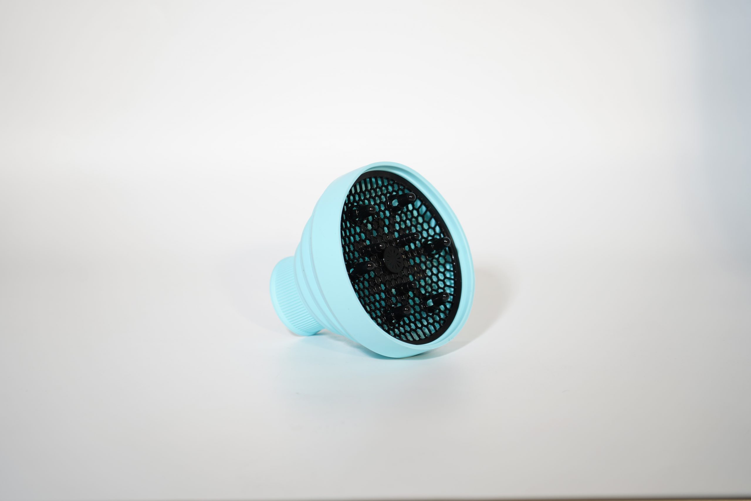 Diffuseur pour sèche cheveux en plastique et caoutchouc. Etirable et adaptable. Couleur unie vert claire.
